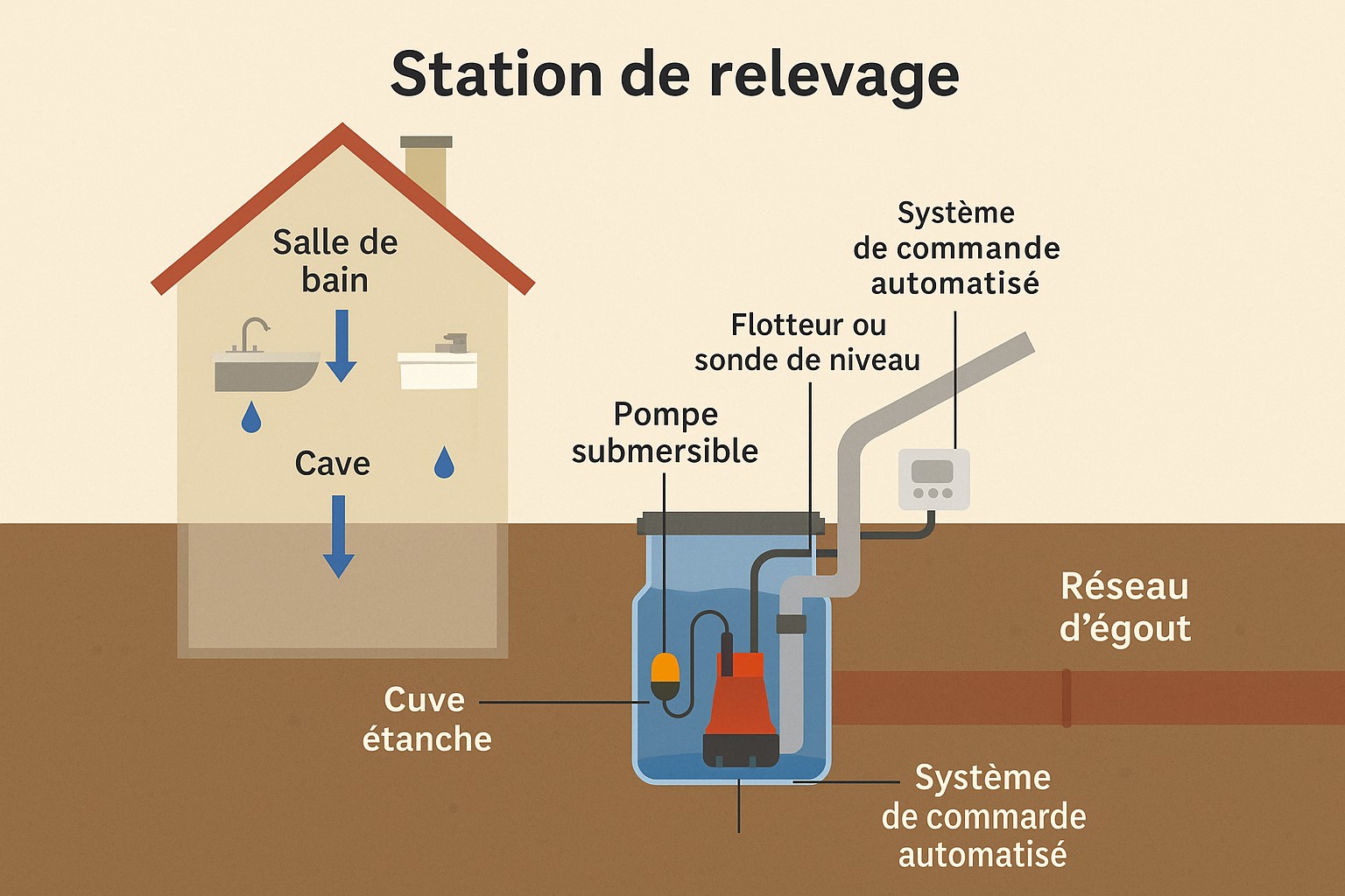 Une station de relevage permet le refoulement des eaux usées vers le réseau d’assainissement quand l’écoulement gravitaire est impossible. Elle est donc indispensable dans les zones en pente ou les caves. Le fonctionnement repose sur un mécanisme de