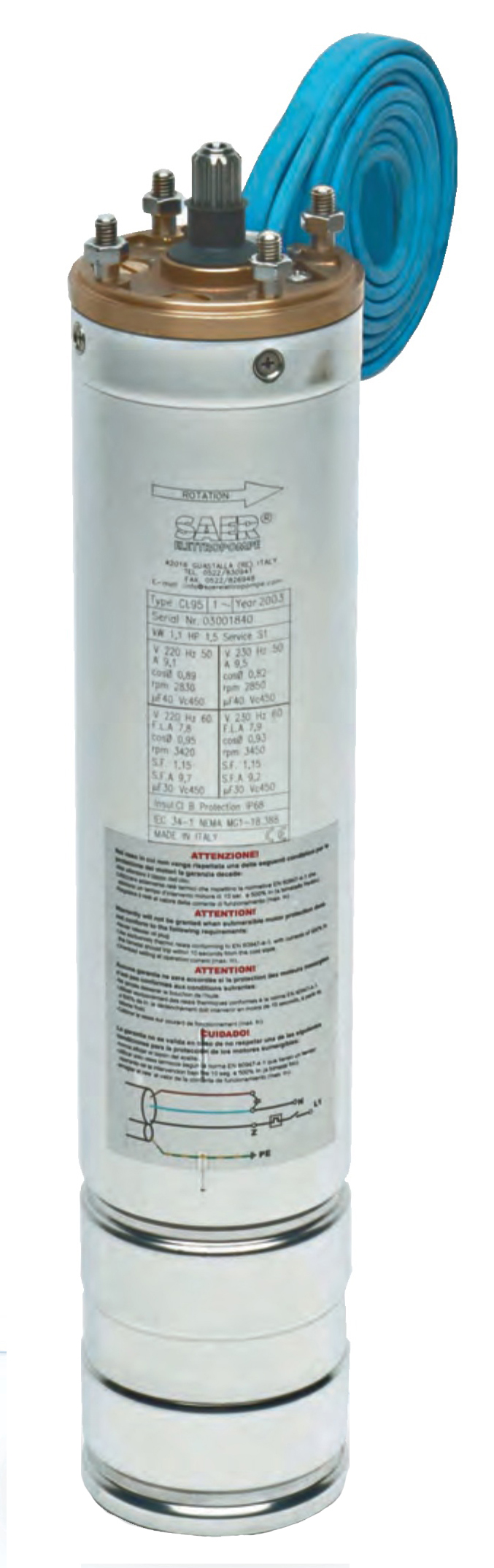 • Le moteur submersible Saer CL95 - CLE95 est conçu pour l'entraînement de pompes immergées radiales ou semi-axiales dans des puits de 4 pouces ou supérieurs