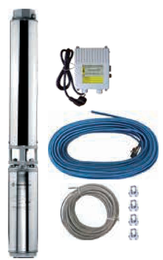 • Ce modèle intègre un coffret de démarrage pour pompes monophasées permettant une mise en service simple et sécurisée. Sa conception préconfigurée avec câble et filin inox facilite l’installation rapide dans le forage. Le système constitue une solution prête à l’emploi limitant les risques d’erreur de dimensionnement sur site