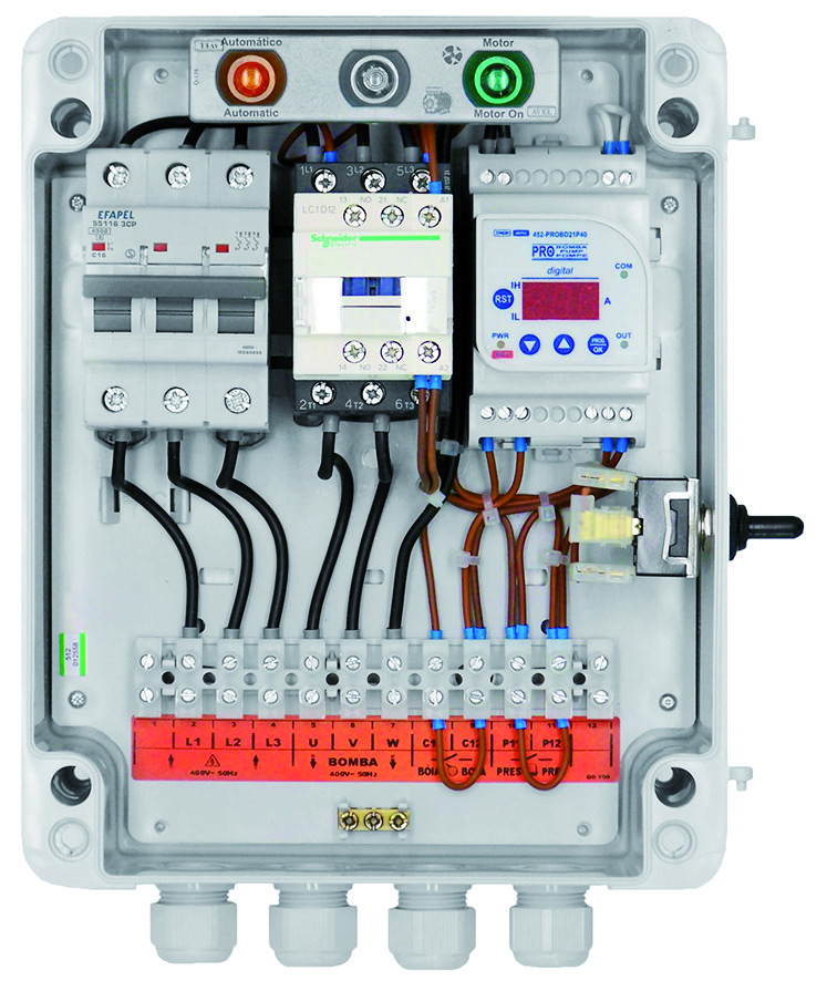 • Le coffret de commande et de protection pour pompe Mr Pompes C550 est conçu pour piloter une pompe immergée ou de surface en toute sécurité. Équipé d'une électronique de contrôle, il assure la surveillance de la surcharge et de la sous-charge moteur. Ce modèle permet un réglage précis de l'intensité jusqu'à 12 ou 25 A selon la version. Sa conception sans sonde simplifie l'installation sur les installations de relevage ou d'alimentation en eau