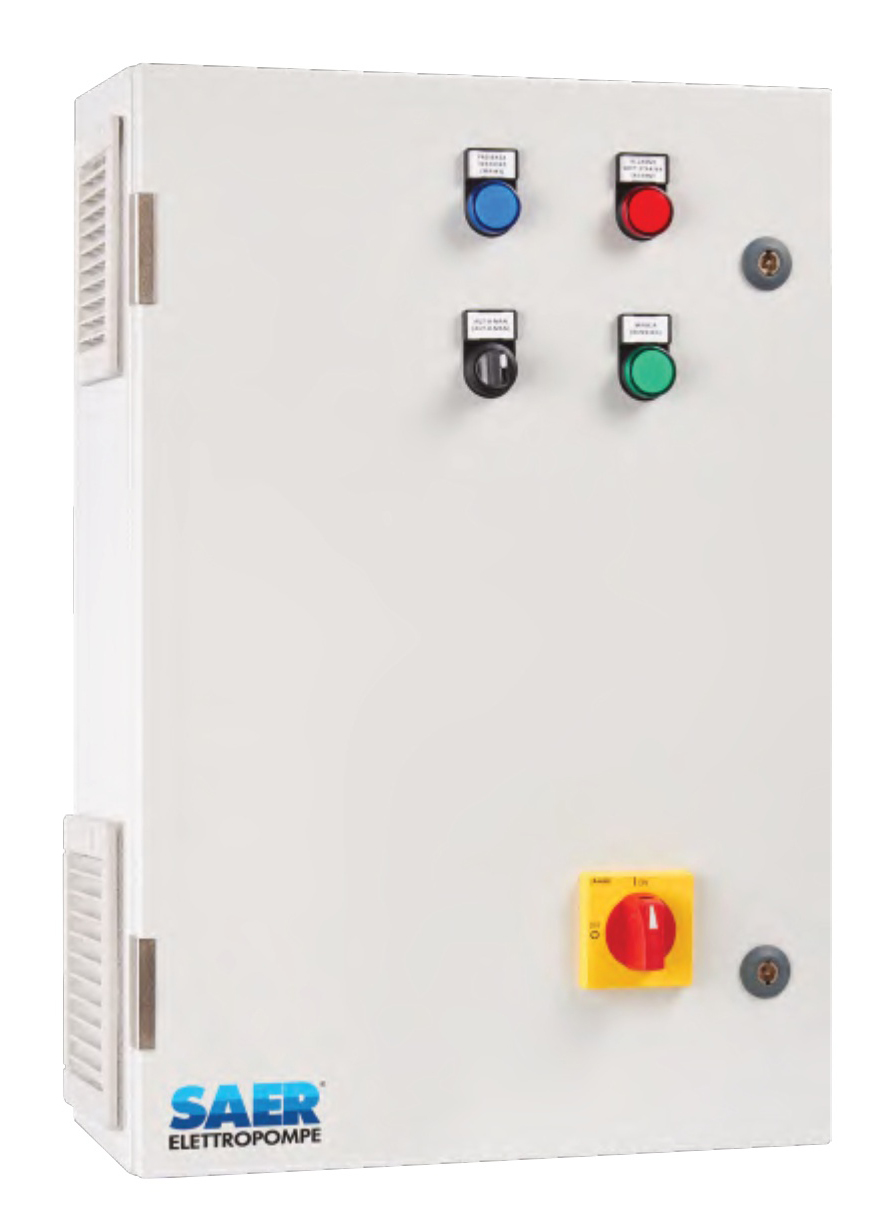 • Le panneau de commande Saer AT5 est conçu pour piloter une pompe triphasée avec démarrage progressif par démarreur électronique soft-starter