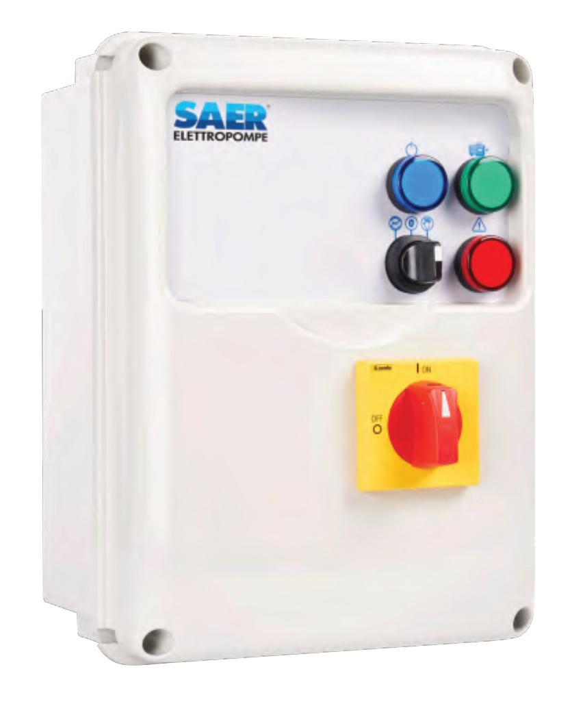 • Le tableau électrique de commande Saer AT1 est conçu pour le démarrage direct de petites pompes immergées, de pompes submersibles ou de pompes de surface pour surpression