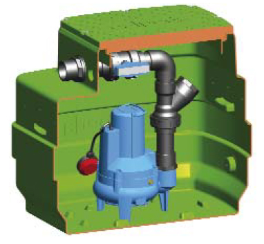 • Equipée de pompe de relevage pour eaux chargées avec pompes séries GMV, GMC