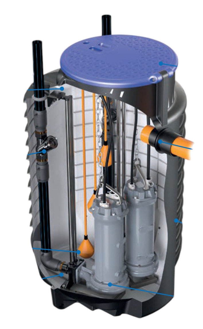 • Double pompe submersible permettant l'alternance et la redondance pour une sécurité accrue