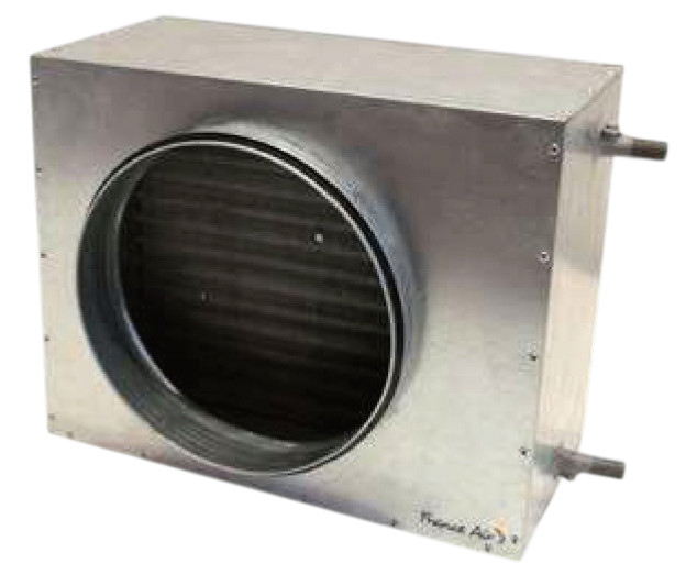 • La batterie de chauffage eau chaude circulaire isolée France Air SYSTAIR EC IS est conçue pour le chauffage terminal de l'air en gaine ou sur plénum