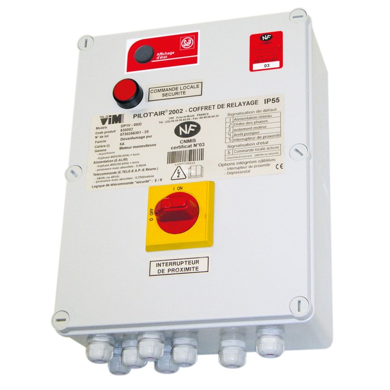 • Le coffret de relayage Vim PILOT'AIR 2002 DP produit assure le démarrage progressif et le contrôle des ventilateurs de désenfumage dans les installations de sécurité incendie